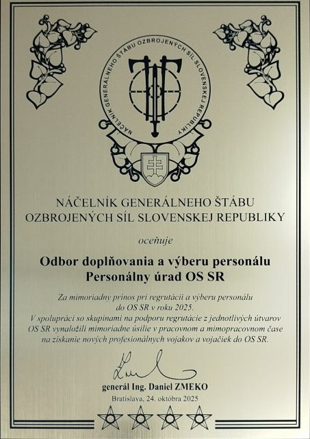 Veliteľské zhromaždenie NGŠ 2025 V dňoch 23.-24. októbra 2025 sa na pôde Ministerstva obrany SR v Bratislave uskutočnilo veliteľské zhromaždenie náčelníka Generálneho štábu Ozbrojených síl SR, počas ktorého náčelník Generálneho štábu OS SR generál Daniel Zmeko odovzdal pplk. Jaroslavovi Župovi ocenenie venované Odboru doplňovania a výberu personálu Personálneho úradu OS SR za mimoriadny prínos pri regrutácii a výbere personálu do OS SR v roku 2025. Týmto ocenením zároveň vyzdvihol vzájomnú spoluprácu so skupinami na podporu regrutácie z jednotlivých útvarov OS SR a ocenil vynaložené mimoriadne úsilie v pracovnom a mimopracovnom čase na získanie nových profesionálnych vojakov a vojačiek do OS SR. Poďakovanie však patrí aj všetkým vojakom a zamestnancom OS SR, ktorí sa aktívne podieľali na pozitívnej propagácií a šírení dobrého mena OS SR.